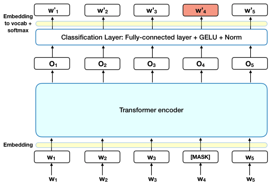 [MASK]토큰 (예: my dog is hairy -> my dog is[MASK]) - 10%: 랜덤 토큰 (예: my dog is hairy -> my dog is apple)