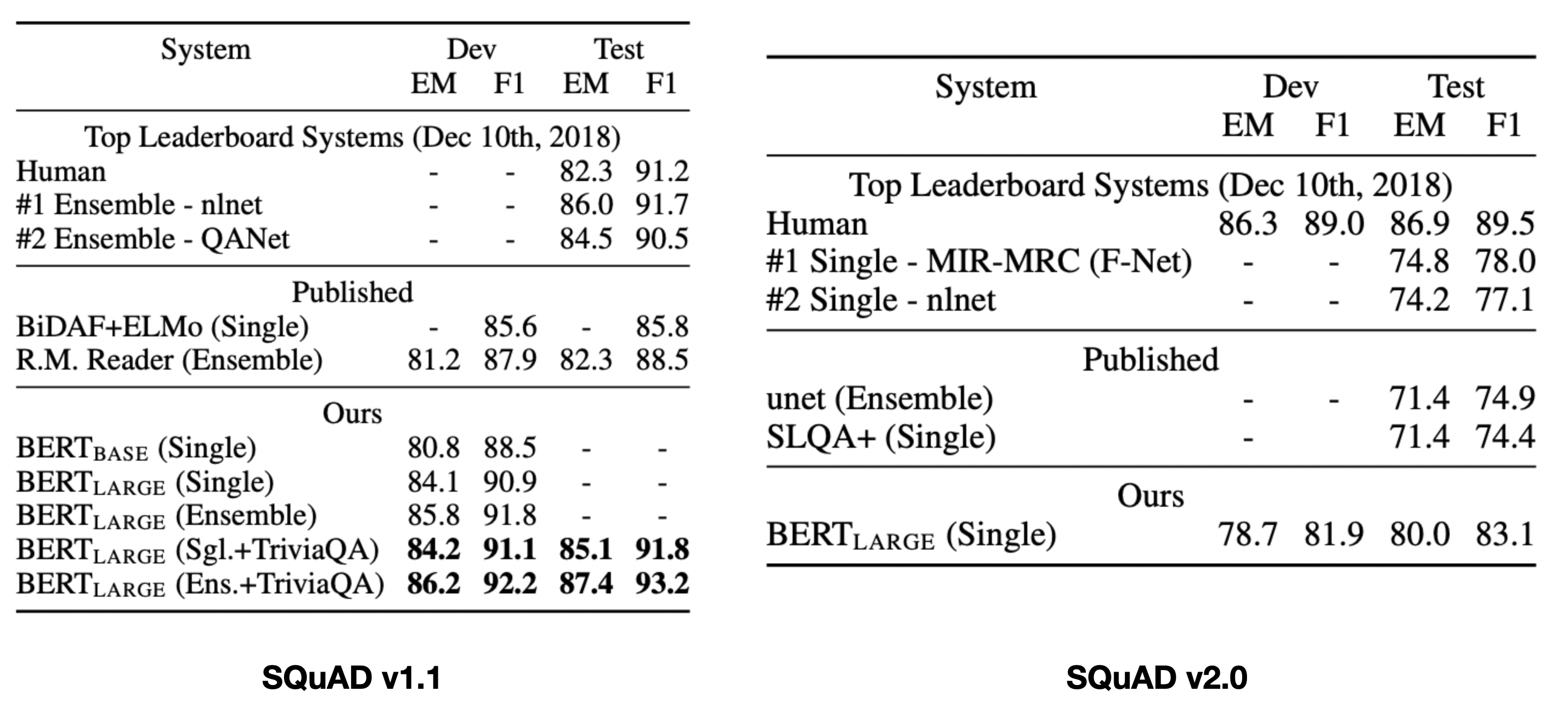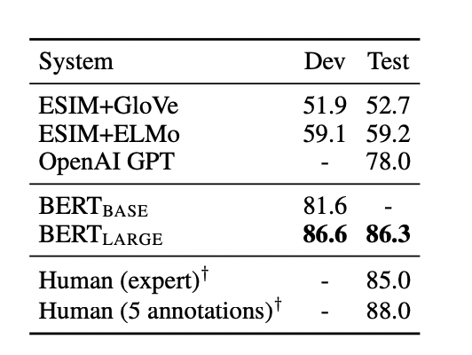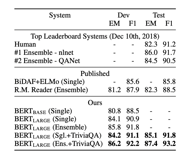 - $\text{BERT}{\text{BASE}}$와 $\text{BERT}{\text{LARGE}}$ 모두 기존 방법보다 우수한 성능 보임